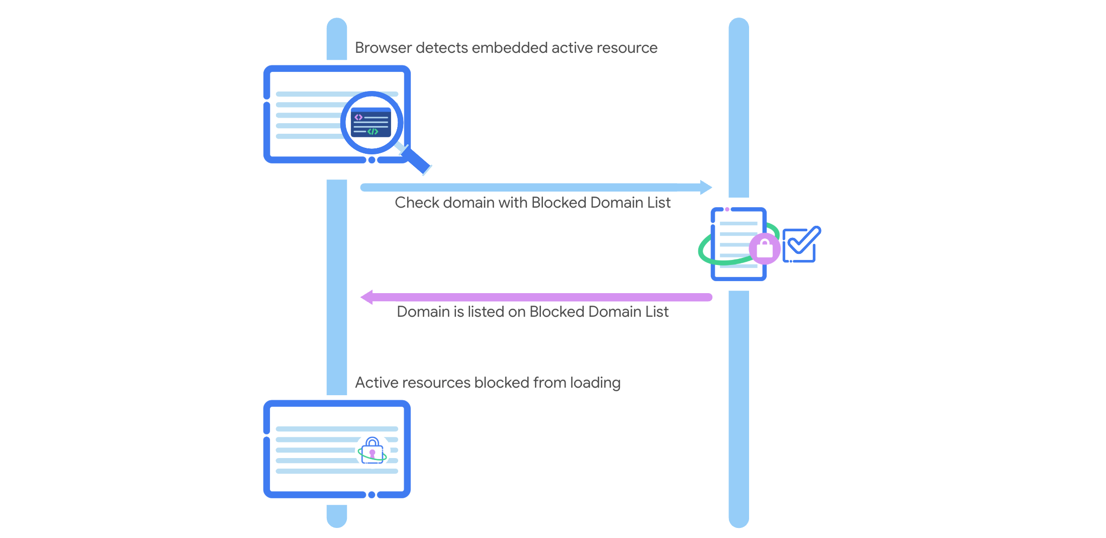 When the feature is enabled, Chrome checks network requests against the MDL. When there is a match for a domain, active resources (that can execute code or perform actions within a web page such as scripts or iframes) from the domain are blocked, but not static resources (for example, images and stylesheets).